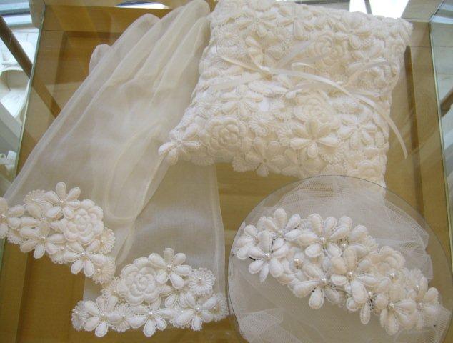 ボンネ・グローブ・リングピロー共に、可愛いケミカル小花のレース